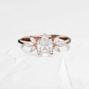 At the center, a radiant pear cut moissanite captures the eye with its timeless beauty, while two trios of marquise-cut moissanites are arranged in a delicate, feather-like formation on either side. This arrangement evokes a sense of lightness and fluidity, with each stone shimmering brilliantly in harmony. Set in a polished 14k solid gold band, this ring embodies a perfect blend of sophistication and unique charm.
