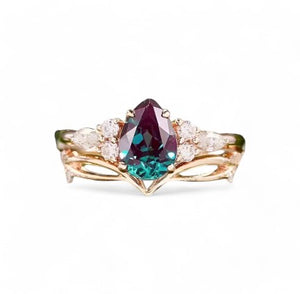 The engagement ring boasts a pear-shaped Alexandrite that shimmers with hues ranging from mesmerizing purples to enchanting greens, making it a dreamy choice for the woman who appreciates sophistication and style.